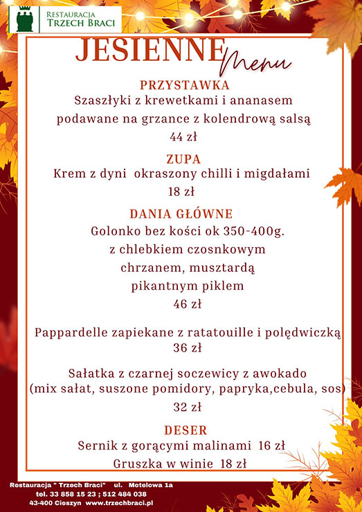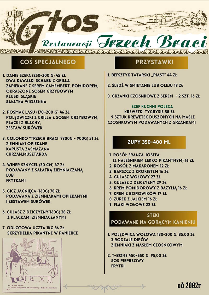 Restauracja "Trzech Braci" powstała w 2002 r. Usytuowana jest niedaleko polsko–czeskiego przejścia granicznego. Początkowo posiadała 2 sale na łączną ilość 90 osób. Wychodząc na przeciw oczekiwaniom naszych gości, w 2015 roku dokonaliśmy rozbudowy, zmieniając wystrój i wielkość sal restauracyjnych, które obecnie mogą pomieścić 130 osób.